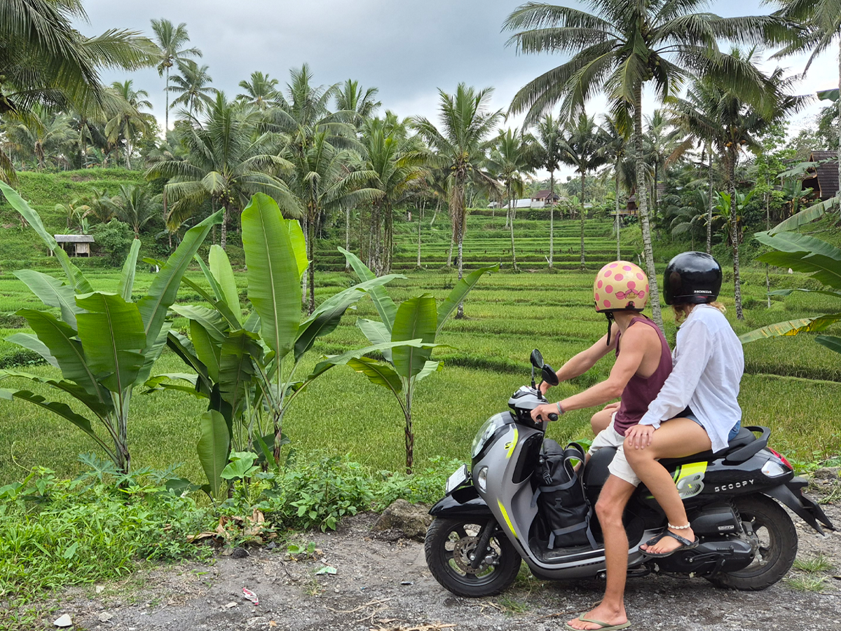 - Lasst euch gern etwas treiben. Schnappt euch einen Roller und erkundet die Gegend. So findet ihr immer wieder tolle Aussichtspunkte mit Blick auf die Reisfelder. Ihr könnt beispielsweise vom Cosy Corner Cafe in die Reisfelder spazieren oder gestaffelte Reisfelder von der abgehenden Straße zum Lesehan & Cafe Sarang Walet sehen. Letzteres liegt nahe dem Wasserfall Air Terjun Sarang Walet, sodass ihr den Ausblick wahrscheinlich ohnehin auf dem Weg dorthin genießen könnt.